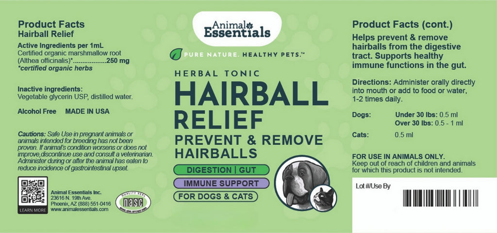 Unlike other hairball remedies which coat the intestinal tract with synthetic petroleum lubricants, Animal Essentials Hairball Relief formula employs the healthful powers of marshmallow root, which contains copious amounts of water soluble mucopolysaccharide compounds (called "mucilage") that are not only fully digestible, but deliver powerful health benefits to your dog or cat. As marshmallow root extract passes through your companion's digestive tract, it's thick, gooey mucilage temporarily coats intestinal membranes with a slippery layer to aid in the quick elimination of ingested hair, while it also serves to feed and maintain healthy populations of resident microflora. But that's not all… numerous studies confirm that marshmallow also supports a immune system health in the gut, where up to 70% of the body's immune system resides.