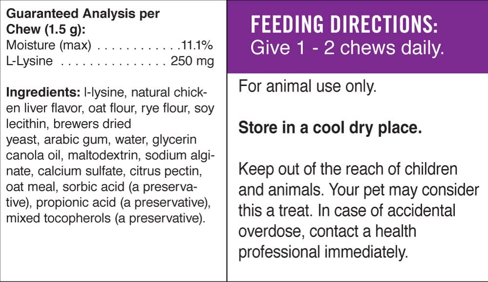 Pet Naturals L-Lysine Chews for Cats is a tremendously tasty feline L-Lysine Supplement. L-Lysine chews support the ideal health of your cat and supports healthy tissue and respiratory and ocular health.